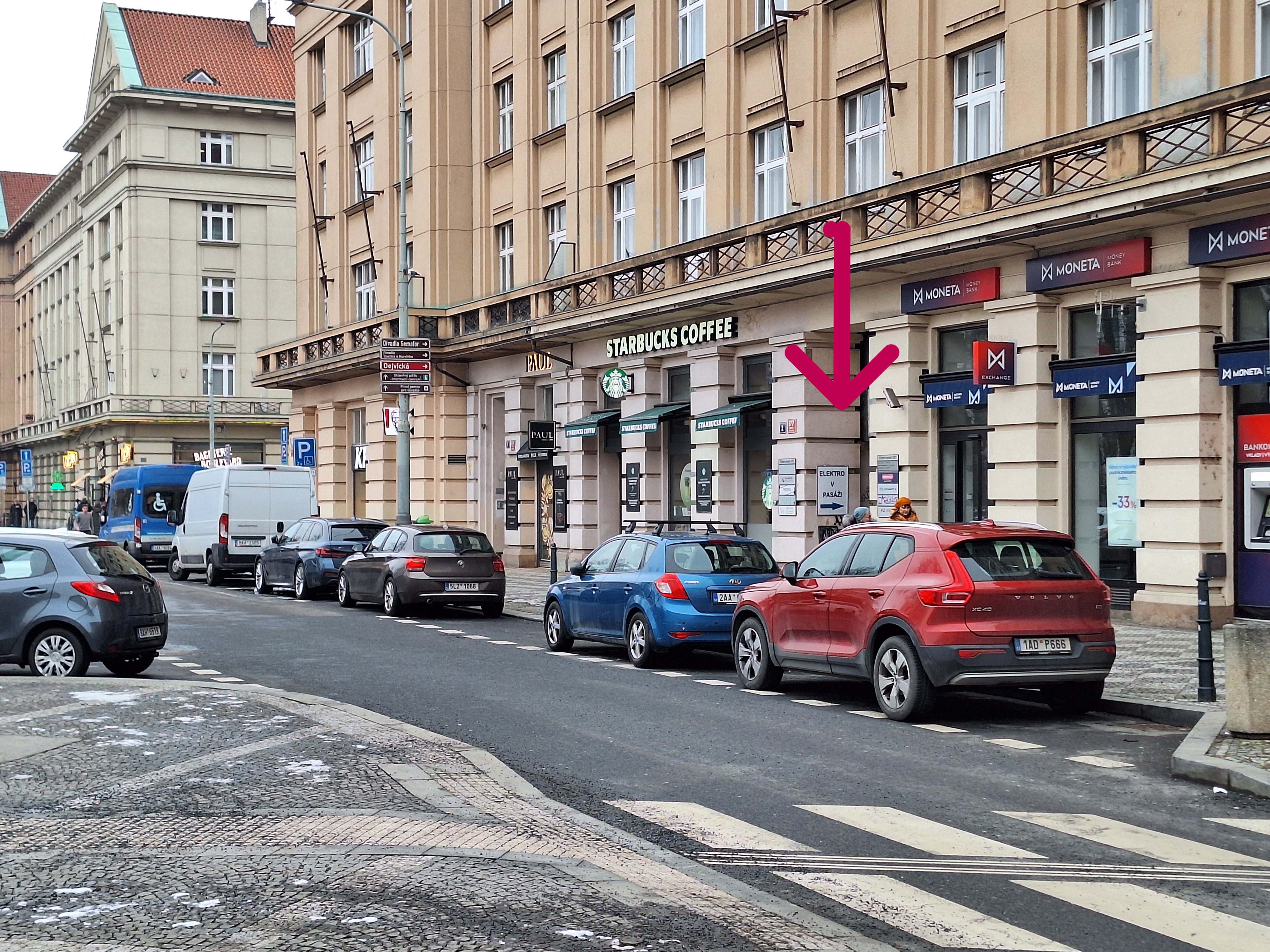 Vstup do Dejvické pasáže je přímo mezi kavárnou Stabucks caffee a pobočkou banky Moneta.